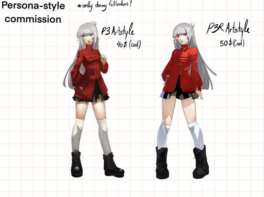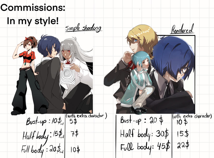 Additional character is 50% of the original price ex: bust-up (simple shading) + additional character = 15$